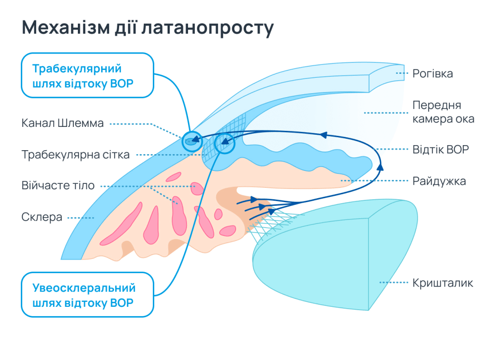 Латанопрост — засіб групи АПГ F2α, який застосовують найчастіше6,7. Він знижує ВОТ, покращуючи відтікВОР двома шляхами8: