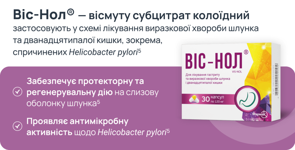 Із цього погляду доцільним може бути призначення квадротерапії з вісмутом, оскільки згідно з аудитом Європейського реєстру з лікування H. pylori лише зазначена схема тривалістю щонайменше 10 днів дає змогу досягти рівня ерадикації понад 90%2. Тому для підвищення ефективності ерадикаційної терапії розгляньте варіант додавання до схеми лікування вісмуту субцитрату колоїдного — Віс-Нол® 480 мг на добу2,5