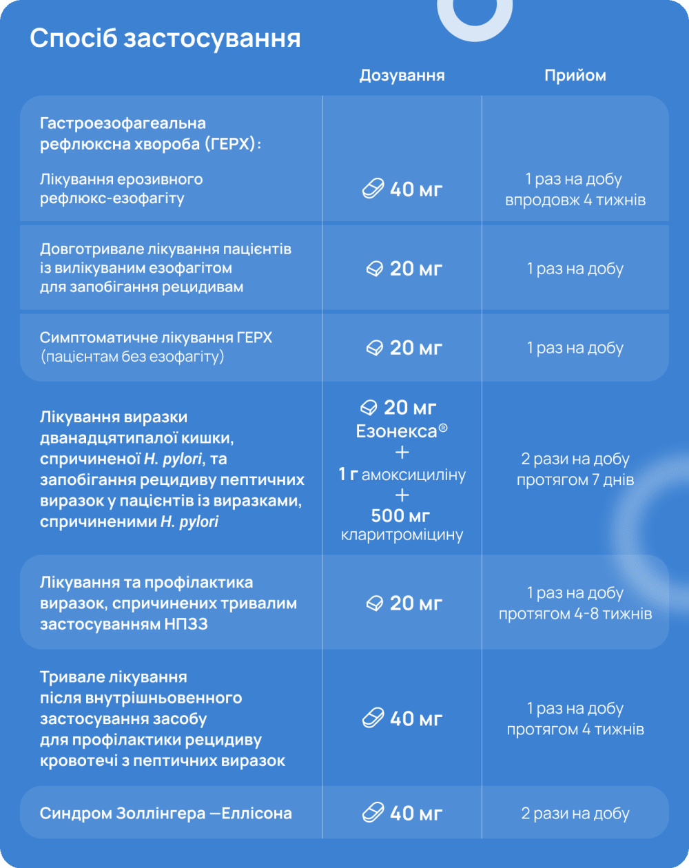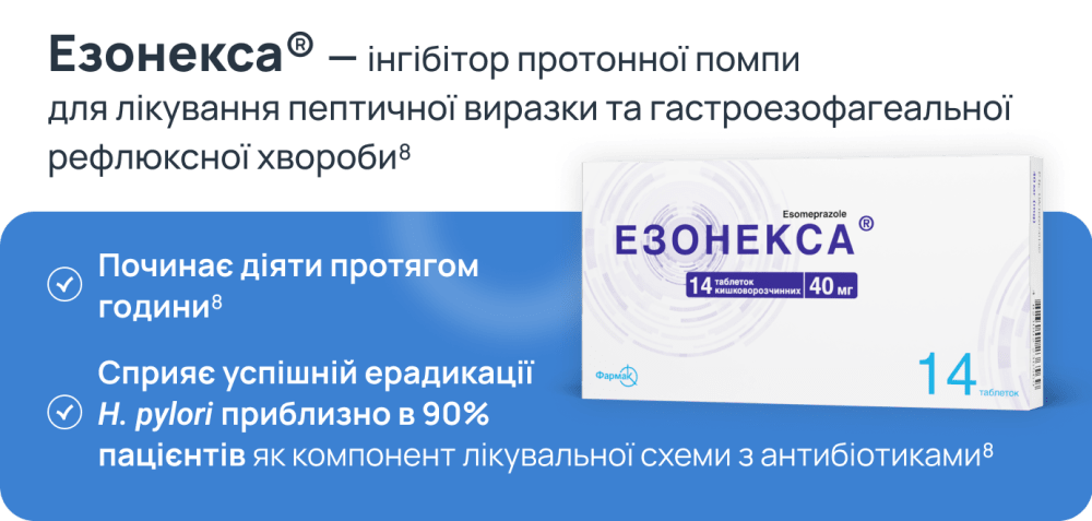 У VI Маастрихтському консенсусі зазначено, що застосування високих доз ІПП двічі на добу підвищує ефективність потрійної терапії3. З урахуванням цього до схеми ерадикації H. pylori може бути додано лікарський засіб Езонекса® (езомепразол) 40 мг на добу в комбінації з іншими елементами ерадикаційної терапії8.