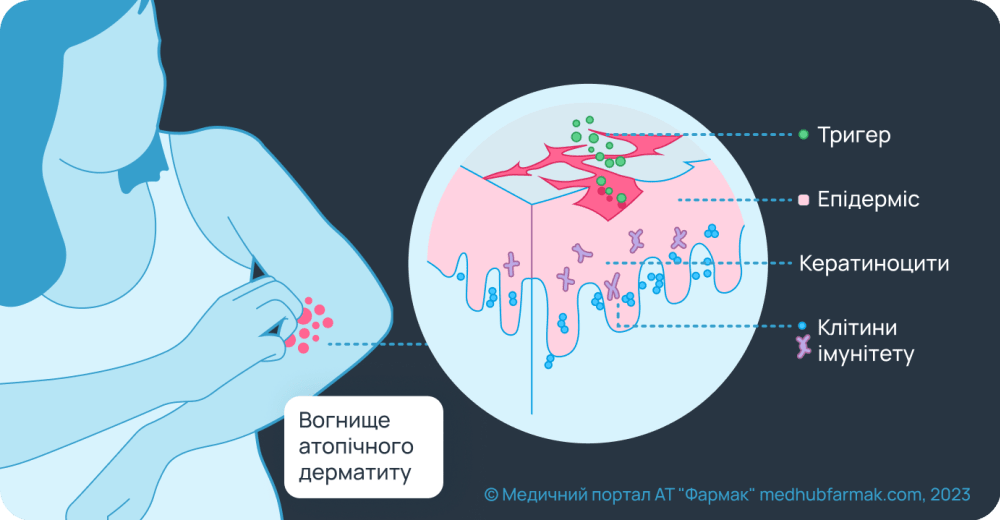 Головними чинниками виникнення хвороби є генетична схильність та порушена імунна реакція. Поєднання цих двох факторів під впливом тригерів навколишнього середовища запускає ланцюг алергічних реакцій, що призводить до порушення гігроскопічного бар’єра рогового шару епідермісу.