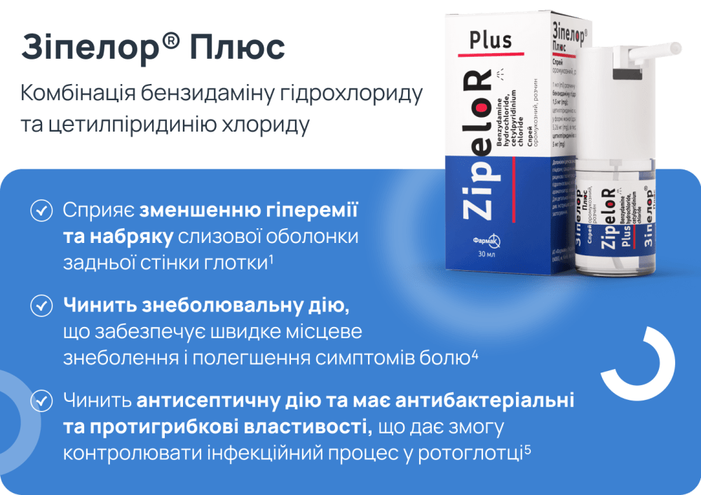 Спрей Зіпелор® Плюс ефективно зменшує вираженість місцевого запалення, полегшує симптоми та підтримує функціональний стан слизової оболонки ротоглотки1.