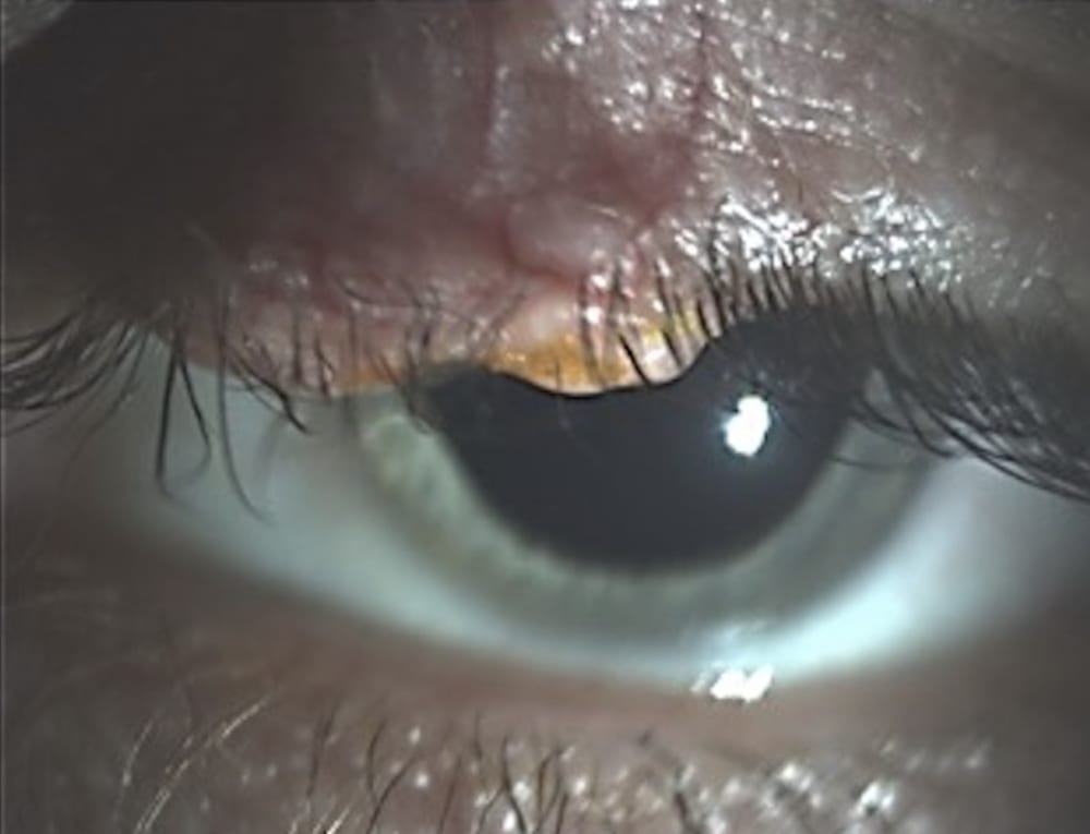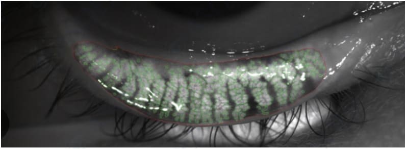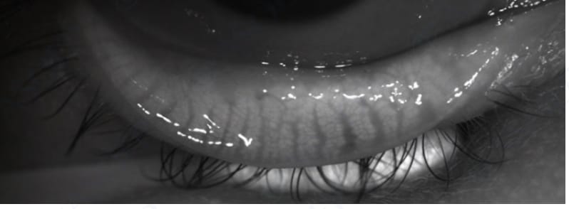 огляд за допомогою щілинної лампи: спостерігається дифузне виділення вмісту мейбомієвих залоз з канальців на інтрамаргінальних краях повіки, для повної візуалізації тканин повіку необхідно вивернути та оглянути зі сторони конʼюнктиви