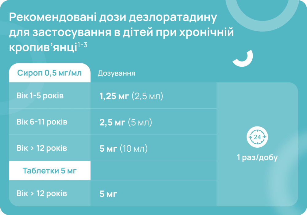 Згідно з рекомендаціями італійських товариств педіатрії, алергології та імунології, дитячої дерматології, дезлоратадин є лікарським засобомвибору для лікування ХКР у дітей1