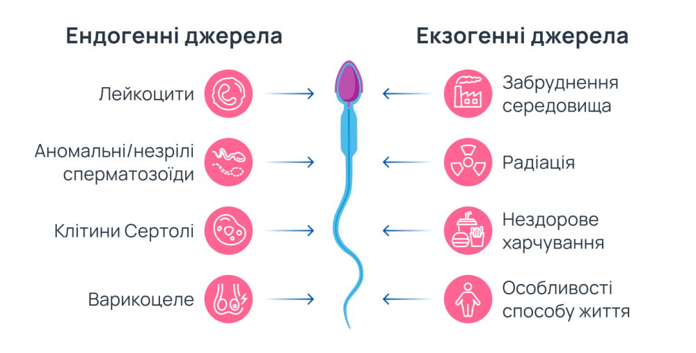 Оксидативний стрес спричиняє ураження аксонем, зниження життєздатності сперматозоїдів, збільшення морфологічних дефектів середньої частини сперматозоїдів3. Він призводить до втрати цілісності мембрани і структурного пошкодження ДНК3.