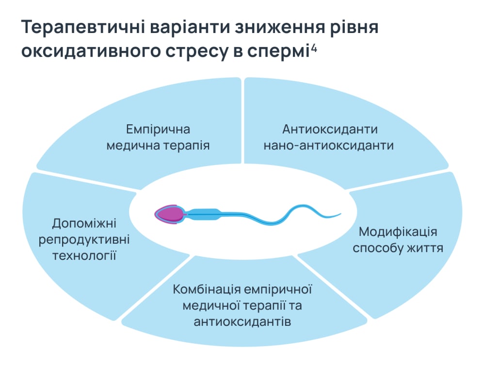 У клінічній практиці все ще бракує стандартизованих підходів до лікування пацієнтів з ідіопатичним або пов’язаним із цим фактором чоловічим безпліддям4. У зв’язку з цим застосовують різні терапевтичні стратегії, спрямовані на покращення якості сперми та зменшення рівня оксидативного стресу4.