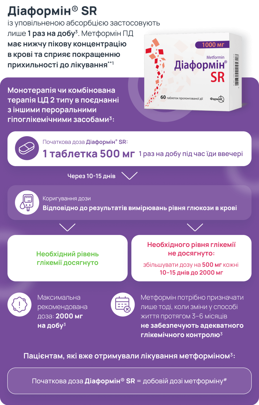 - Інструкція для медичного застосування лікарського засобу Діаформін® SR, таблетки пролонгованої дії по 1000 мг. РП №UA/11856/01/02.