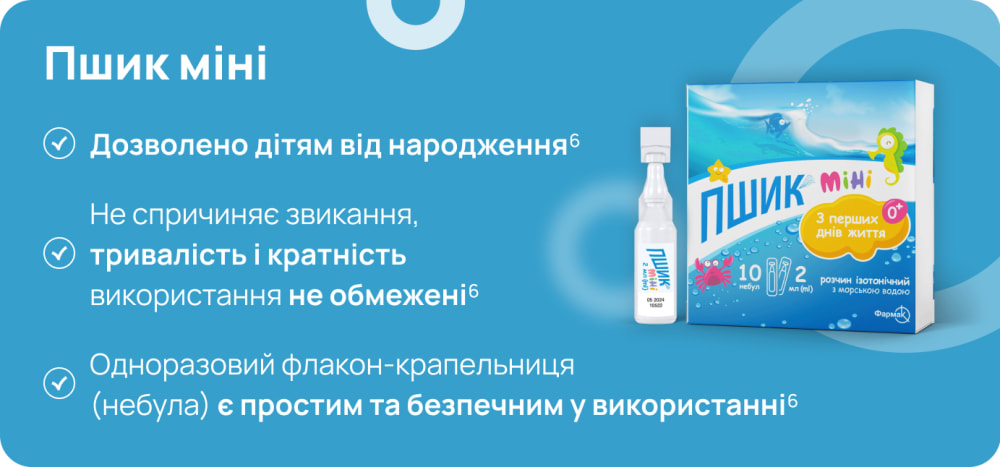 Пшик міні в формі пластикових небул по 2 мл розраховано на однократне використання, що забезпечує зручність та стерильність. Відсутність консервантів у складі дає змогу використовувати Пшик міні в дітей різного віку, зокрема новонароджених, у вагітних та жінок, які годують груддю. Він показаний як для щоденної гігієни носа, так і для полегшення стану пацієнта при запальних захворюваннях носоглотки1,6.