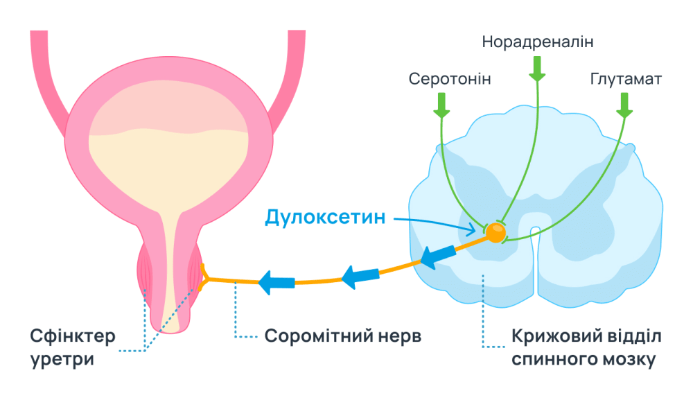 Дулоксетинблокує нейрональний механізм зворотного захоплення серотоніну та норадреналіну в синаптичній щілині4.