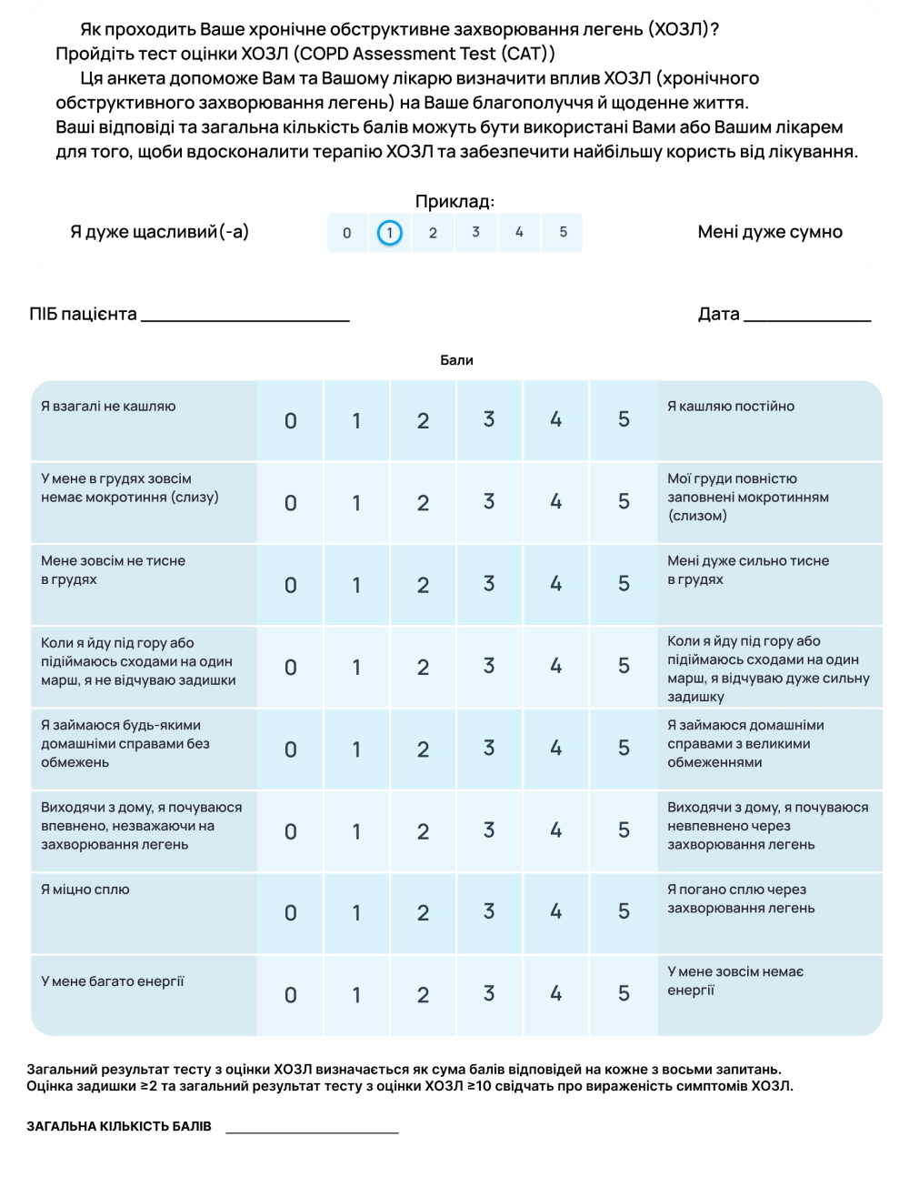 Завантажити для роздрукування своїм пацієнтам тест з оцінки ХОЗЛ (COPD Assessment Test — САТ)