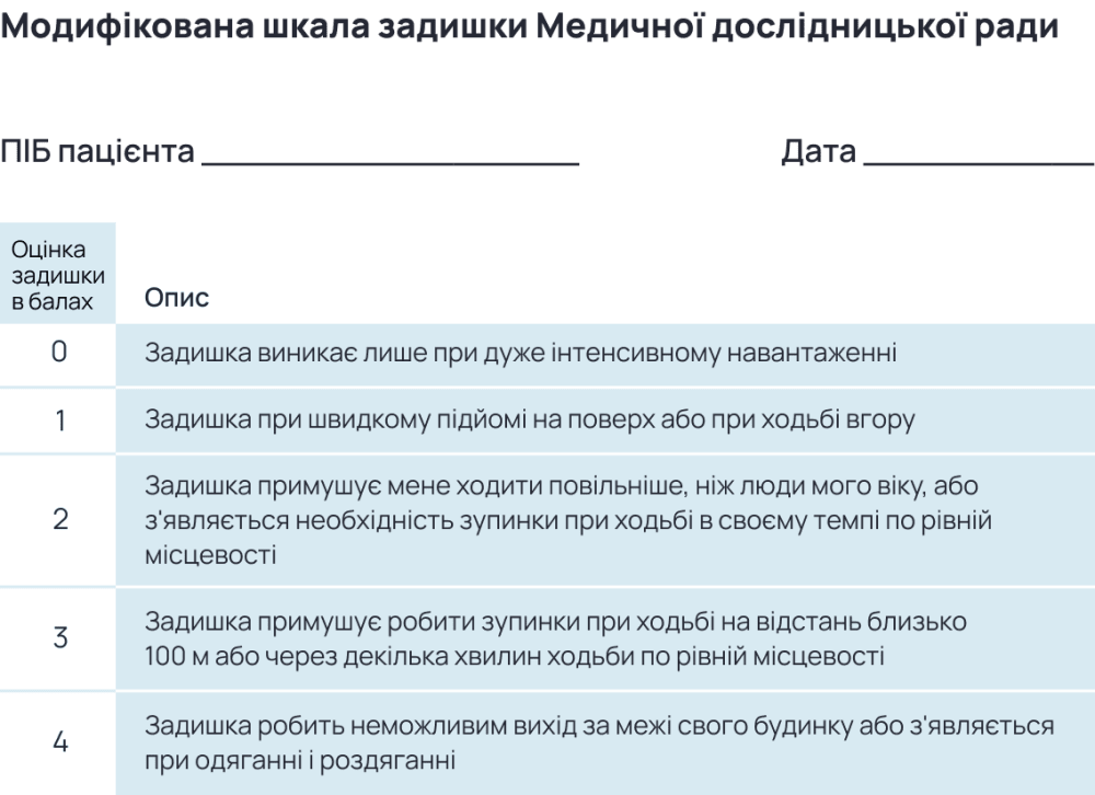 Завантажити для роздрукування своїм пацієнтам mMRC опитувальник — модифіковану шкалу задишки Медичної дослідницької ради (мМДР)
