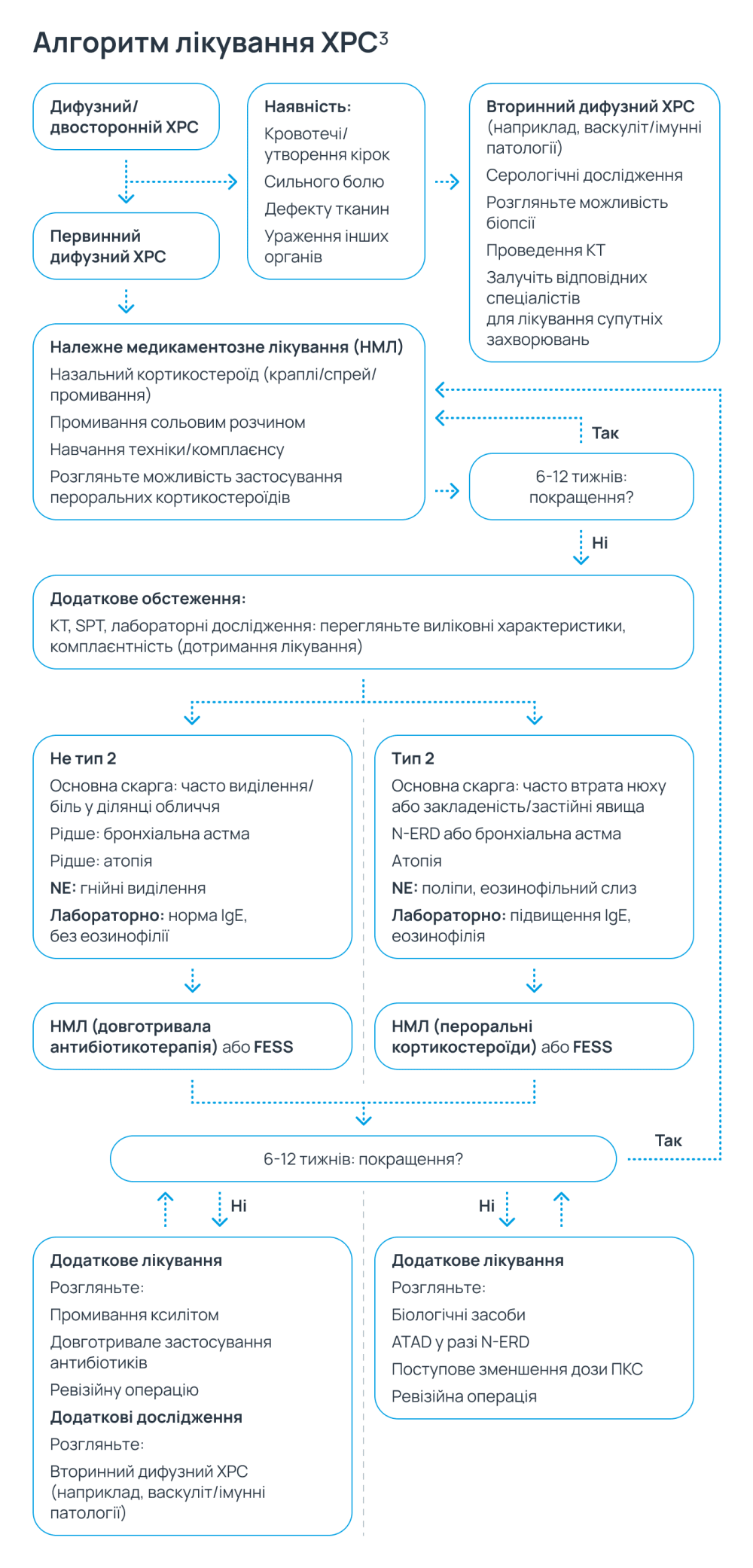 При ХРС можливе застосування: інтраназальних глюкокортикостероїдів, системних глюкокортикостероїдів, іригаційної терапії сольовими речовинами, ЛАКД-терапії3