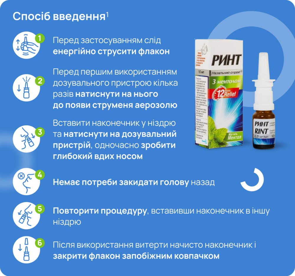 - Інструкція для медичного застосування лікарського засобу Ринт назальний спрей з ментолом, 0,5 мг/мл по 10 мл у флаконі. РП №UA/12119/01/01.
